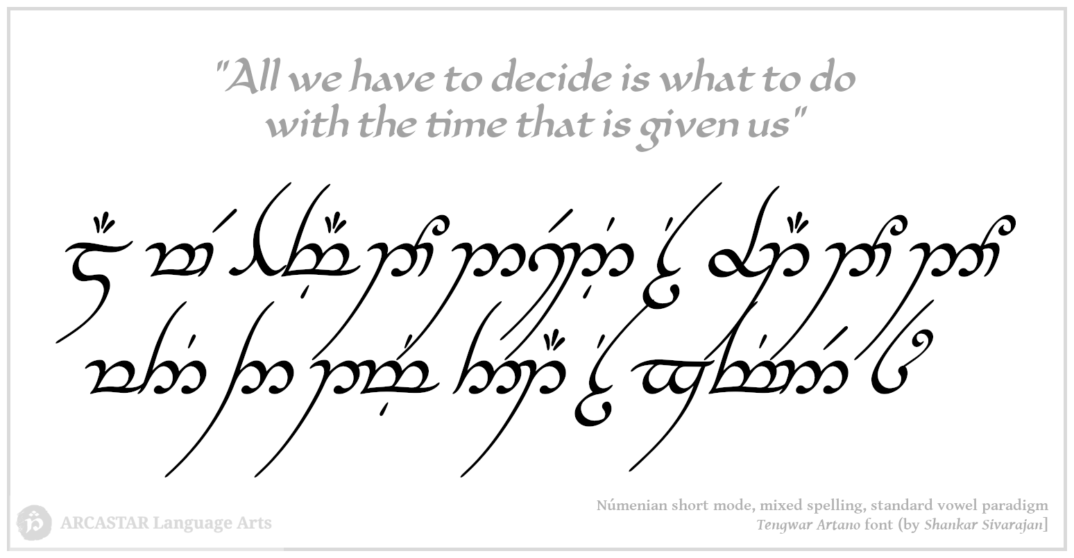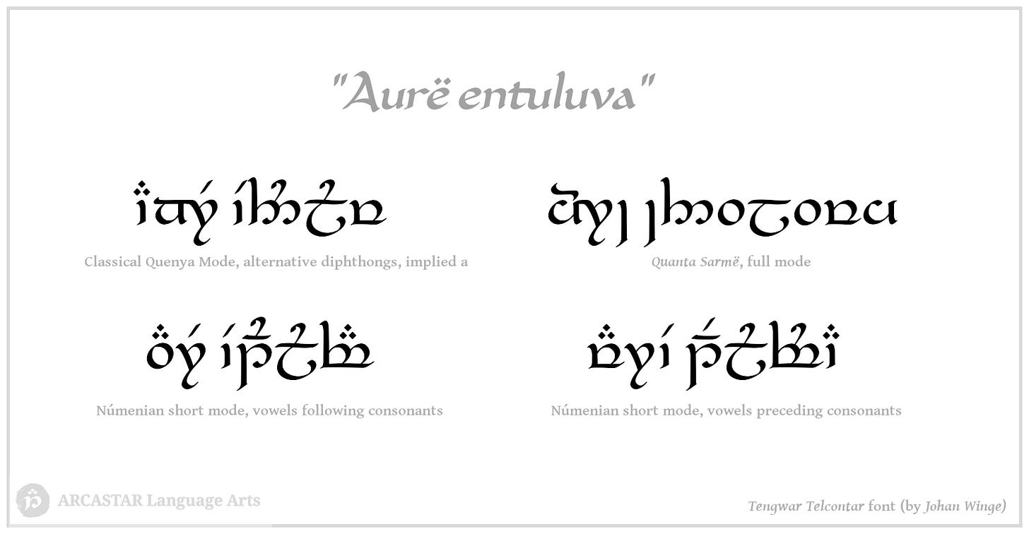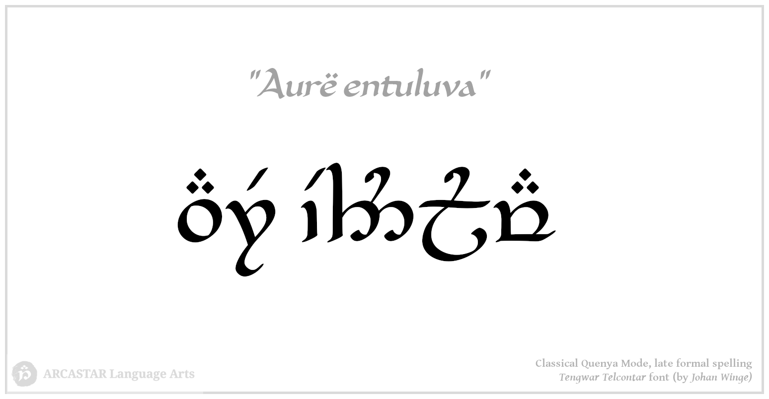 First we have a different approach to the Classical Mode, in which the vowel a need not be spelt out but can be implied from bare consonant letters by context (hence what looks like entuluv is actually still entuluva. Often consonants that are actually bare have a dot placed underneath, but I chose not to do so, because the original samples I was emulating also don’t, and native speakers certainly understand the words from context. Here I also spelt au out with the regular letter for the semi-vowel form of u, upon which the a diacritic must not be set because aurë would indeed read warë then (this spelling of this word is explicitely attested).