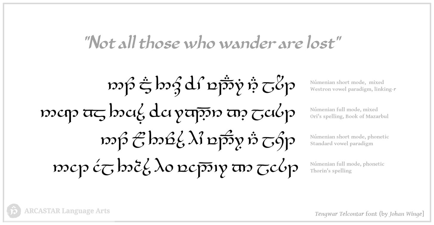 First another very similar spelling, but with the vowel signs for e and i swapped (which is commonly done in Westron spelling and often seen in English texts), and also with the r in “wander” spelt as a full consonant because of the following vowel.