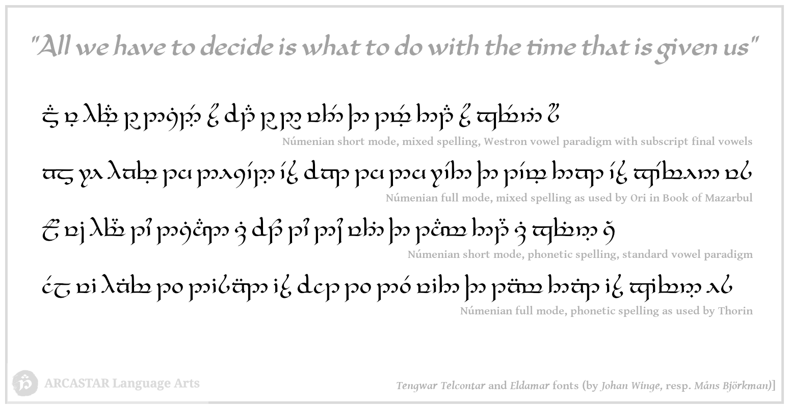 In the bottom left we have a Númenian spelling, i.e. the general use of the Third Age as seen above for English, employed here for Quenya. Here the vowel order remained the same as in Classical mode, and as far as we know the same spelling for au can be used.